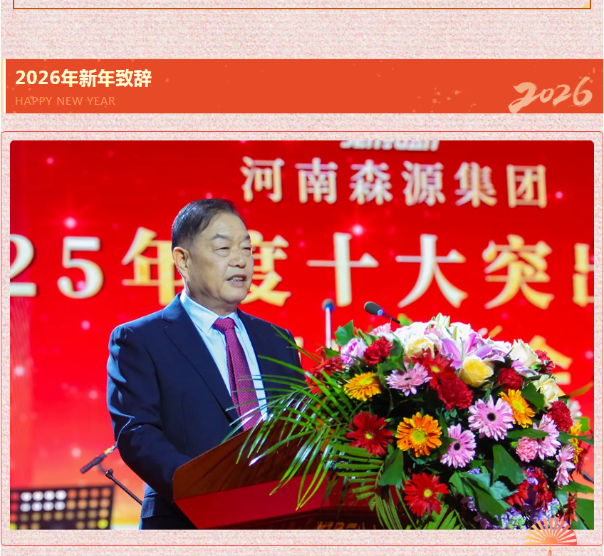 新元肇啟,萬(wàn)象更新。森源集團(tuán)黨委書(shū)記楚金甫新年致辭,向全體干部員工及社會(huì)各界朋友致以誠(chéng)摯的新年祝福。他回顧了過(guò)去一年集團(tuán)砥礪奮進(jìn)的歷程與來(lái)之不易的成績(jī),明確了2026年的發(fā)展目標(biāo)與重要任務(wù),號(hào)召全體森源人接續(xù)奮斗,持續(xù)鞏固公司穩(wěn)中有升的良好發(fā)展勢(shì)頭,為實(shí)現(xiàn)森源向新向優(yōu)的高質(zhì)量發(fā)展而努力奮斗!